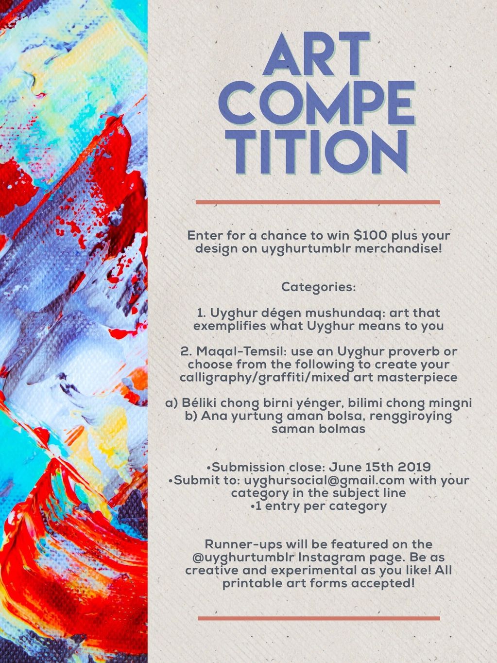 The advertisement for our first Art Competition. This was advertised in English, Uyghur, and Russian to reach as many people as possible and we received submissions from a diverse number of places! We hope even more artists can participate in the next one!