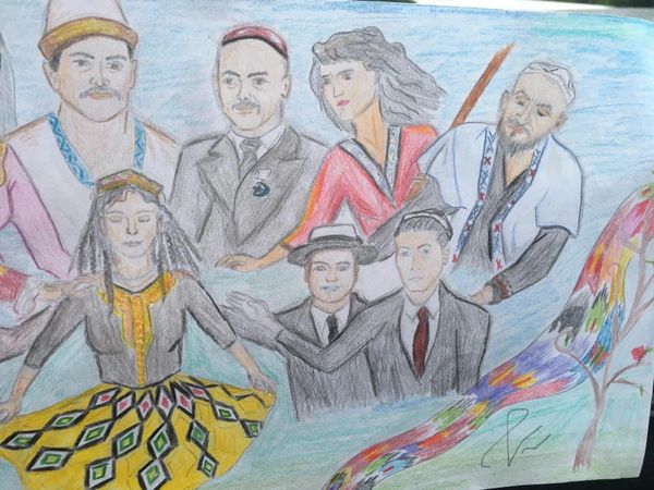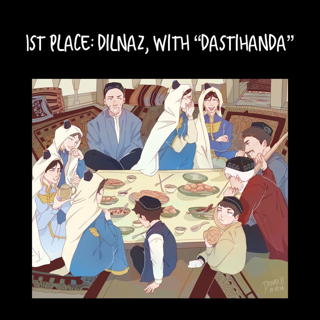 Dilnaz, 15, came first place in our first art competition with her work, Dastihanda. According to the entry, it "describes a family gathering (dinner) in Keriye County, Hotan, East Turkistan".