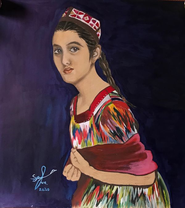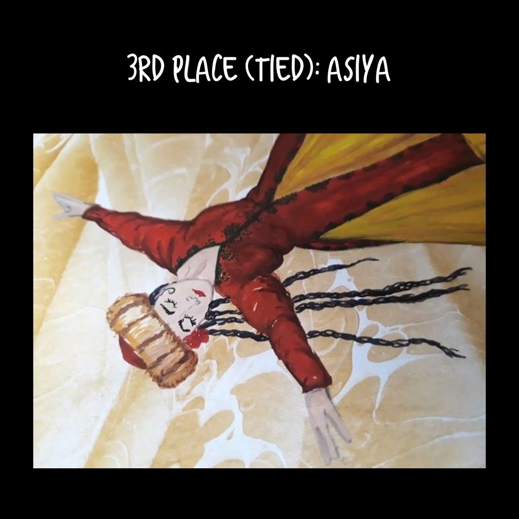 Asiya tied at third with her piece depicting a woman in traditional Uyghur dress.