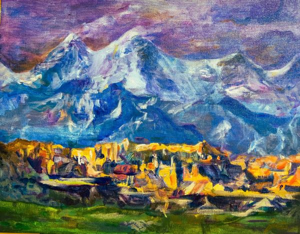 Judge’s comments: This looks to be the work of someone with quite a bit of traditional art experience. Let us start with a few suggestions: 1. always think of an expression when you paint, what is it about this image that you want to express? Is it how big and majestic the mountain in the background is? Or is it how interesting, raw and intimate the village is? Make a choice and focus on that part. If it is the mountain then it should be much bigger in visual weight compared to the village for example, and not closer to 50/50 as it is right now. 2. The white ring around the mosque in the middle right of the image is very distracting. It needs to be in a darker colour and less perfectly round, right now it looks like a collar bone of a human neck, which I don't believe is the painter's intention. Now onto the good parts, the mountain texture looks wild, harsh and unforgiving, as it should be, transferring us to our homeland aided by the portrayal of an intimate, familiar village. The colours chosen are mostly great, apart from some of the almost white areas, the rest look natural and harmonious, with the blue playing against the yellow green.