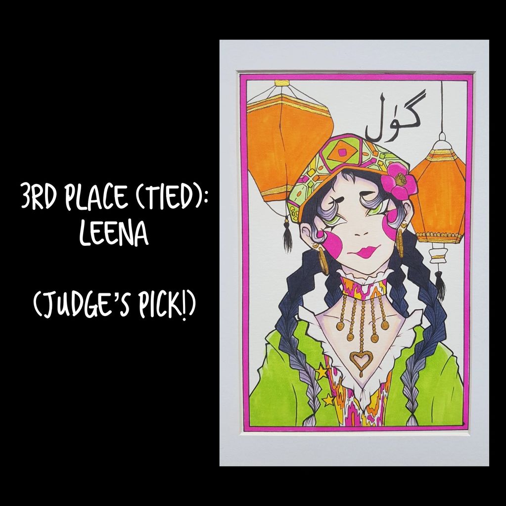 Leena, a new high school graduate, tied at third and received the highest score from our judge for her artwork depicting an Uyghur girl with the word "gul" - flower - written behind her.